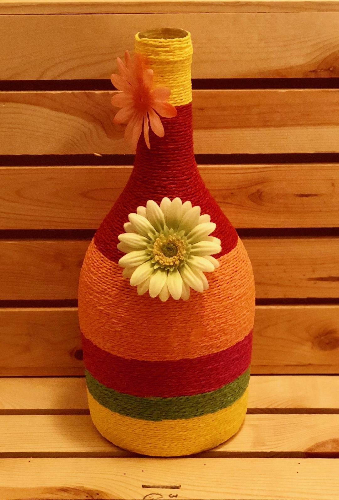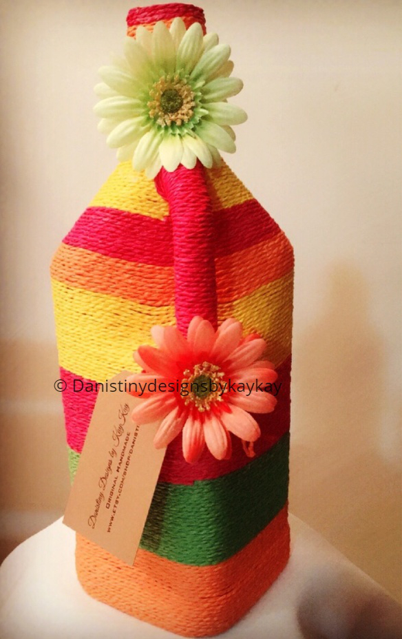 ONLY ONE LEFT!!! Recycled glass bottle vase, wrapped with colored cord and accented with flowers. Given the name ‘Bloomer Bud' because of its colorful abundance, this piece will definitely add life and vibrancy to your home. Water can be added if you choose to add fresh flowers, this is a great addition to your home decor, perfect for gifts.